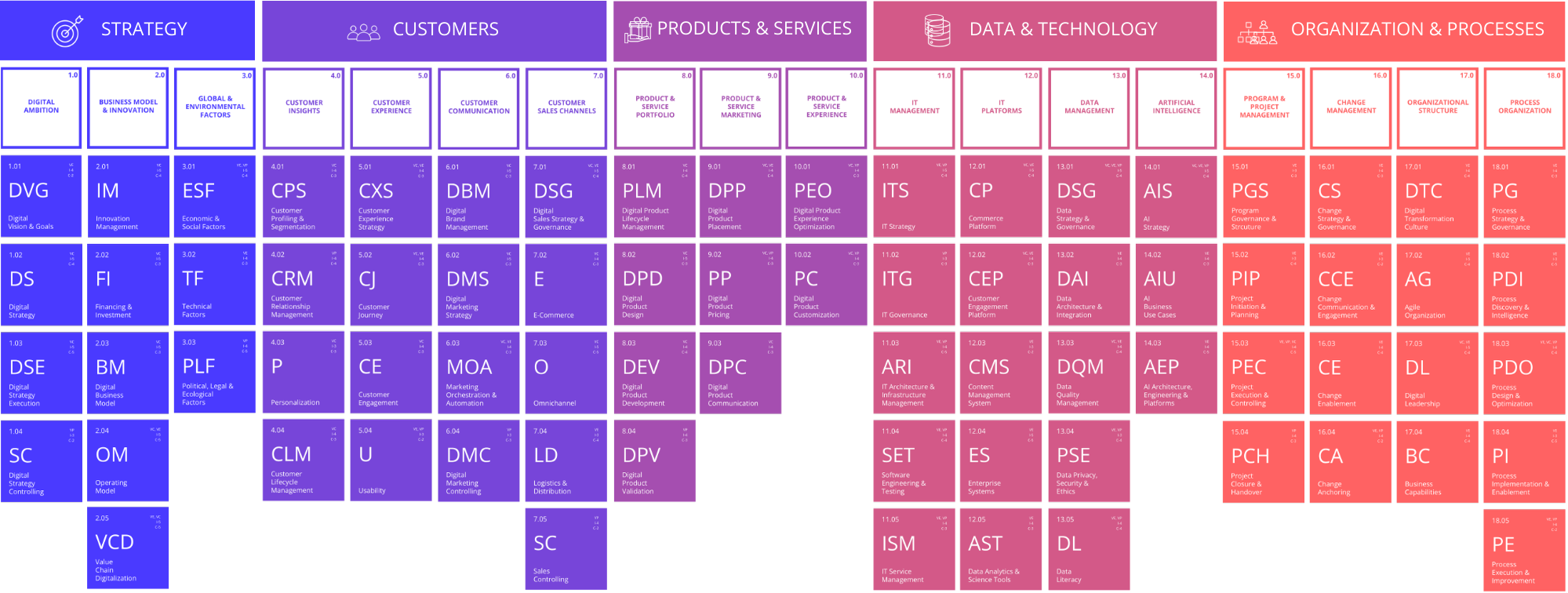 Unser Digital Excellence Framework befähigt Unternehmen, eine klare digitale Vision und konkrete Ziele zu entwickeln, ihren digitalen Reifegrad systematisch zu analysieren und darauf aufbauend eine wirkungsvolle Digitalstrategie abzuleiten und erfolgreich umzusetzen.